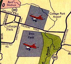 An undated aerial view looking north at ERCO Field (foreground) & College Park Airport (background) from a 1987 article (courtesy of Jim Higgins).