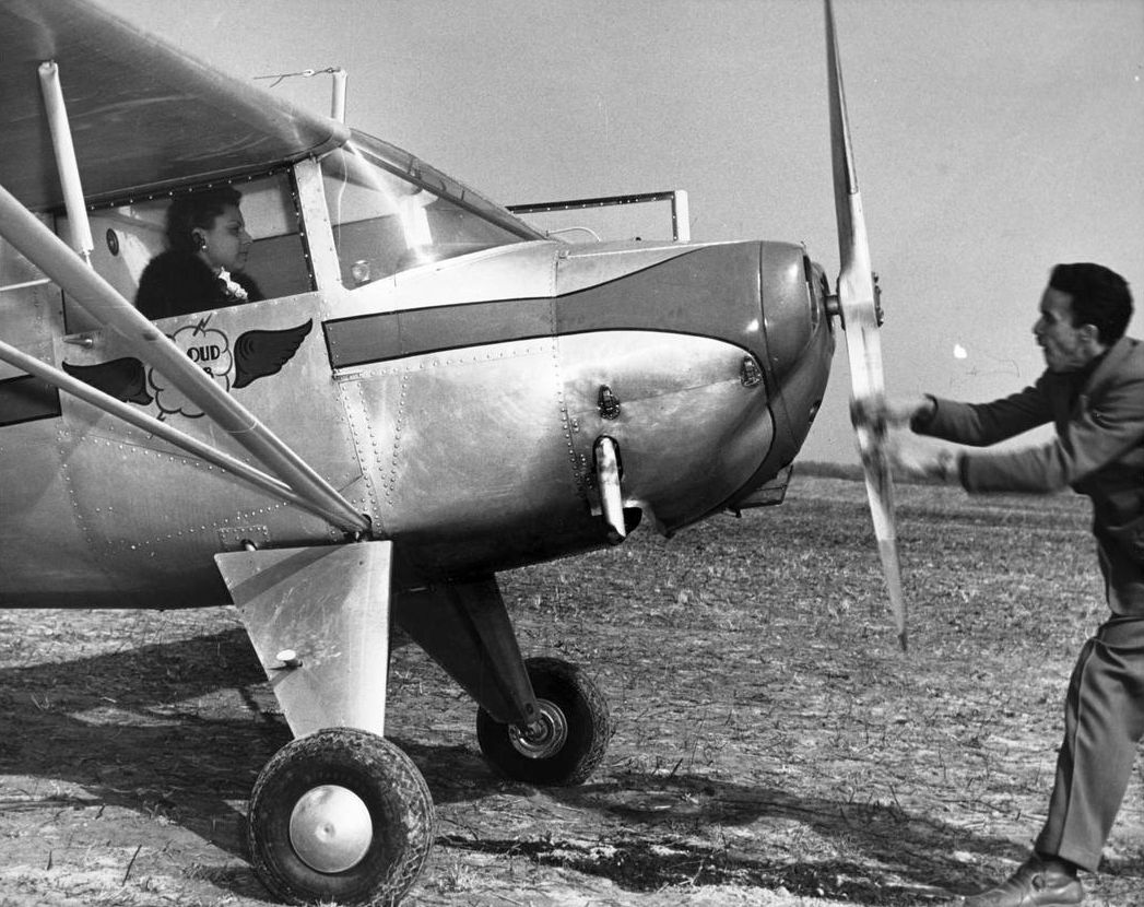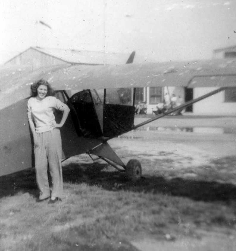 A circa 1945 photo (courtesy of Debbie Campbell) of her mother, Jo Conrad, in front of her 1942 Aeronca F-65 at Hyde Field.