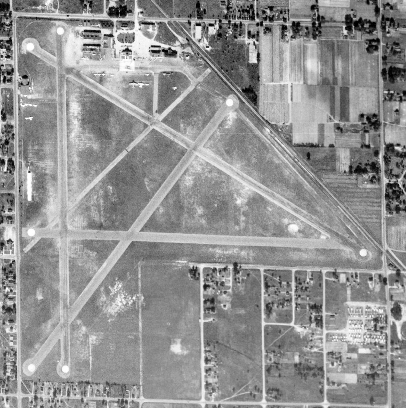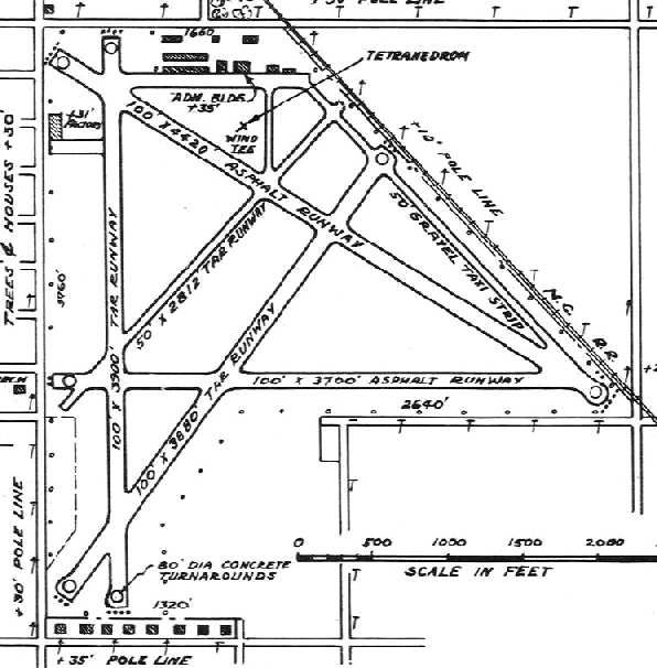 It shows the original runway layout at the north end of the field, as well as the newer concrete Runway 18/36 which extended toward the south.