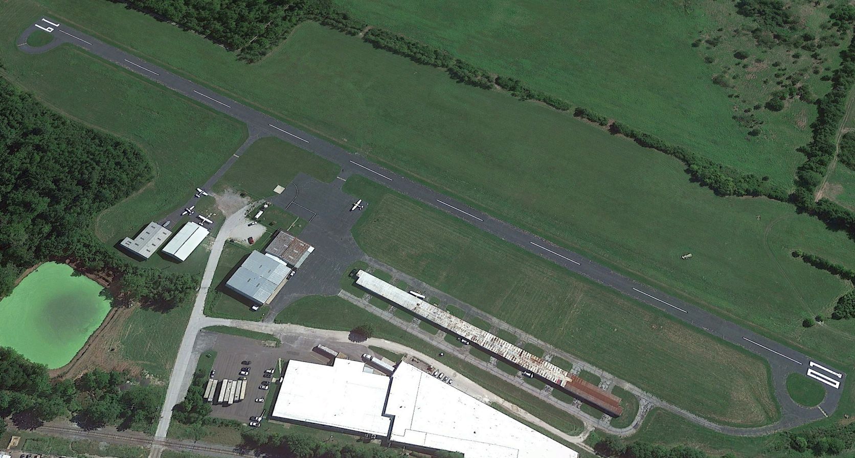 A 1984 aerial view depicted Lucas Airport having an asphalt Runway 18/36, and there was no longer any sign of the unpaved crosswind runway.