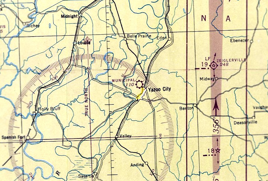 The earliest depiction which has been located of Yazoo City Municipal Airport was on the April 1947 Shreveport Sectional Chart.