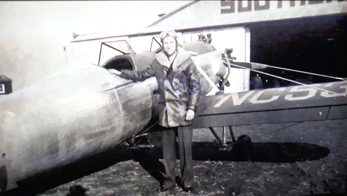 A circa 1950 photo of Creighton Evans & a Ryan PT-19 in front of the Sanders Field Southern Air Services hangar (courtesy of Charlie Evans).