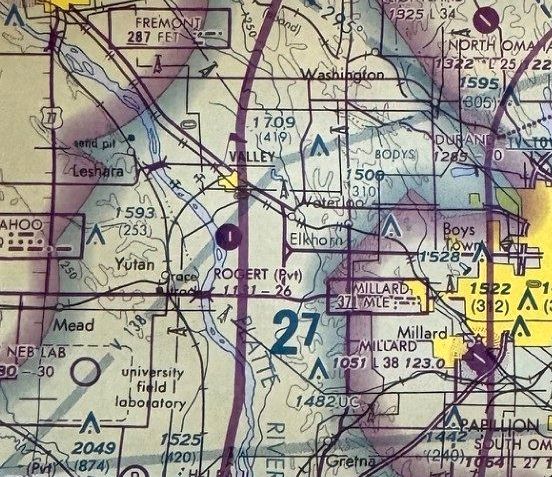 The last aeronautical chart depiction which has been located of Rogert Airstrip was on the February 1999 Omaha Sectional Chart.