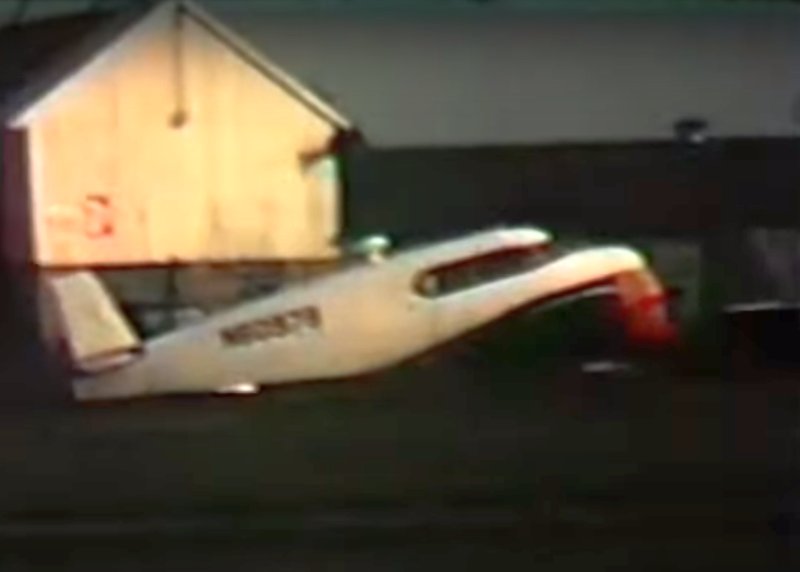 A circa 1976 photo by Neal Lanetti of the remains of the Hanover Airport hangar after the fire, ironically showing an insurance sign on the hangar wall.