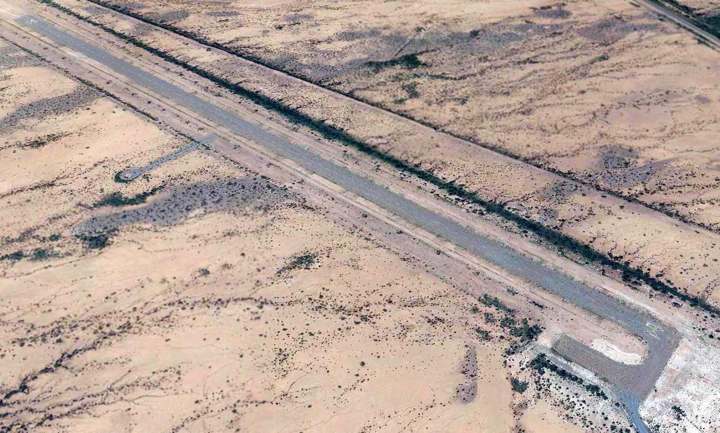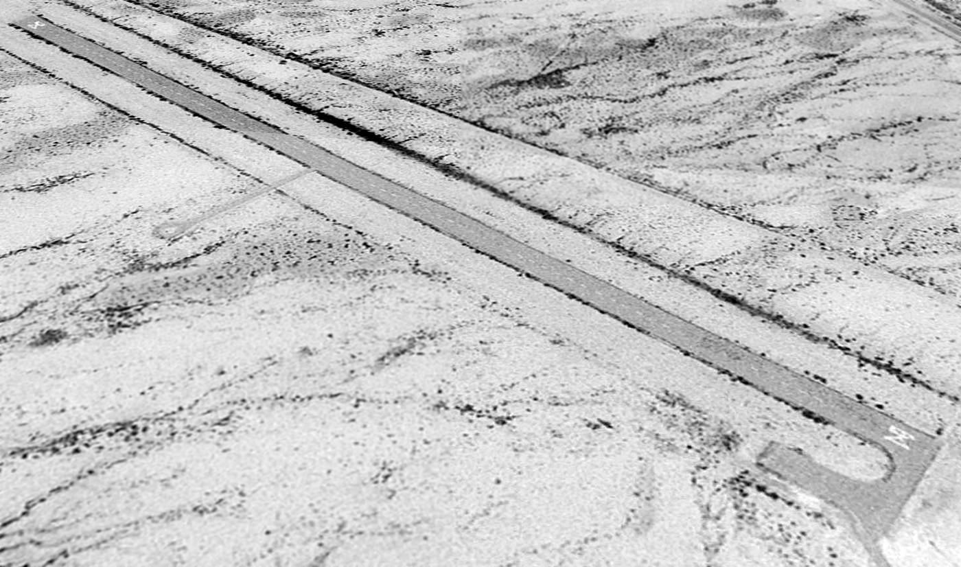 A 2013 aerial view looking west along the abandoned runway at Oscura AAF.