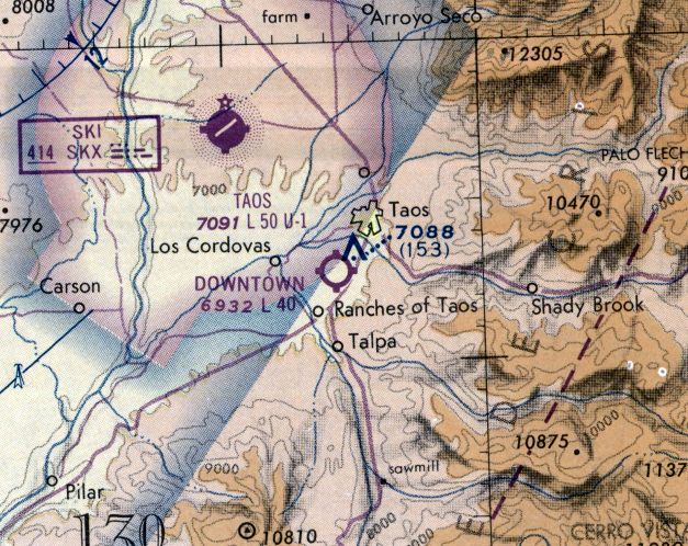 The last aeronautical chart depiction which has been located of the original Taos Airport was on the September 1952 Trinidad Sectional Chart.