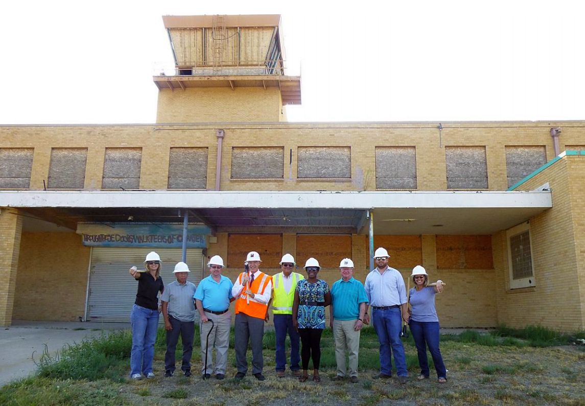 A photo of Roswell city employees gathered to begin the demolition of the Roswell Airport terminal building