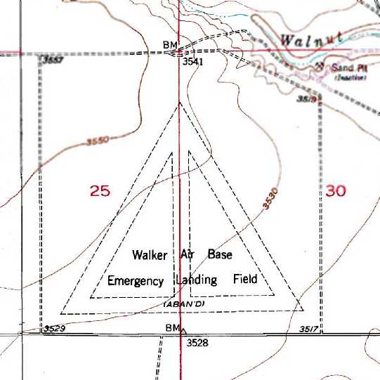 The 1975 USGS topo map only depicted a single runway (northeast/southwest), labeled “Walker Air Base Auxiliary Landing Field #3 (Abandoned)”.