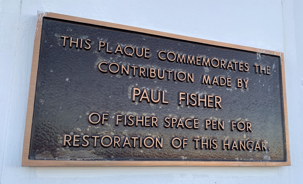 The plaque is dedicated to Paul Fisher, inventor of the Fisher Space Pen, for financing the restoration of the hangar.”