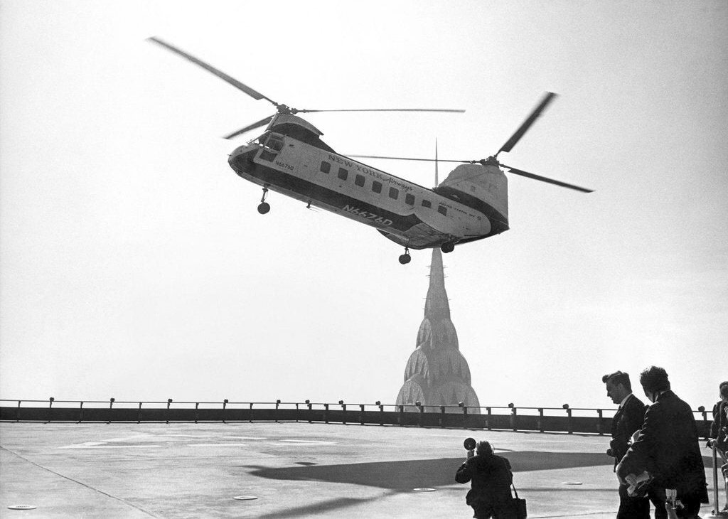 A circa 1960s photo of a NY Airways Boeing Vertol 107-II helicopter over the Pan Am Heliport, with the Chrysler Building in the background (courtesy of Jonathan Westerling).