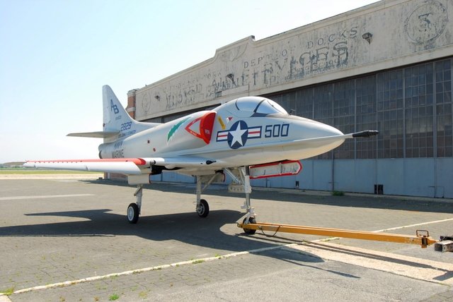 A 2007 photo by Butch Moran of a restored Douglas A-4 Skyhawk in front of a Floyd Bennett Field hangar.