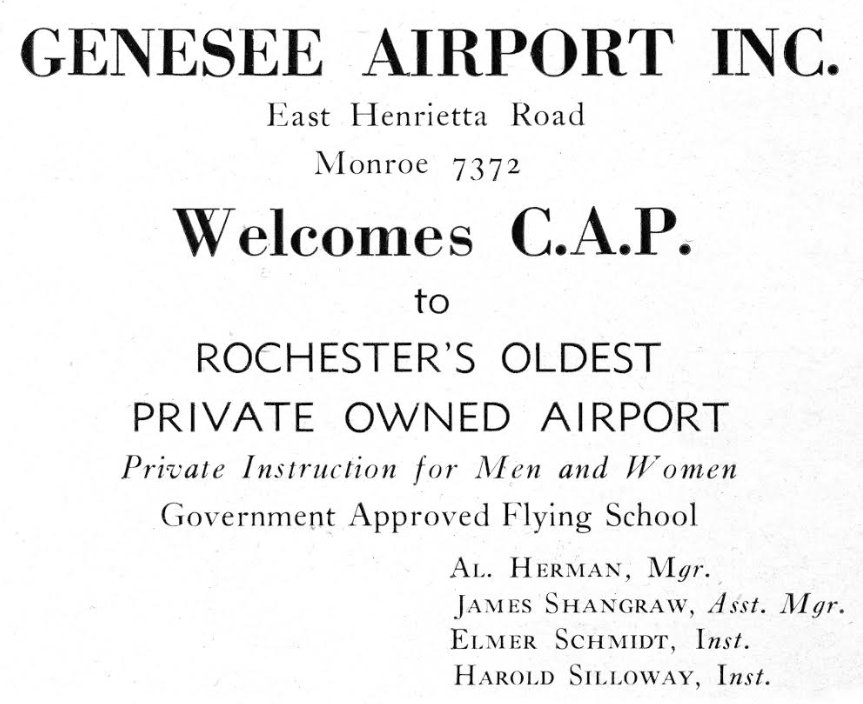 An advertisement for Genesee Airport from the 2/26/44 Civil Air Patrol meeting program booklet (courtesy of Alan Reddig).