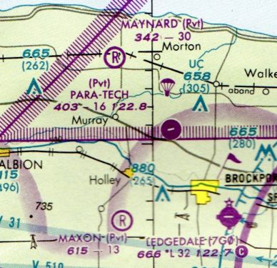 The last aeronautical chart depiction which has been located of Ridgeway Airpark was on the November 1957 Albany Sectional Chart.
