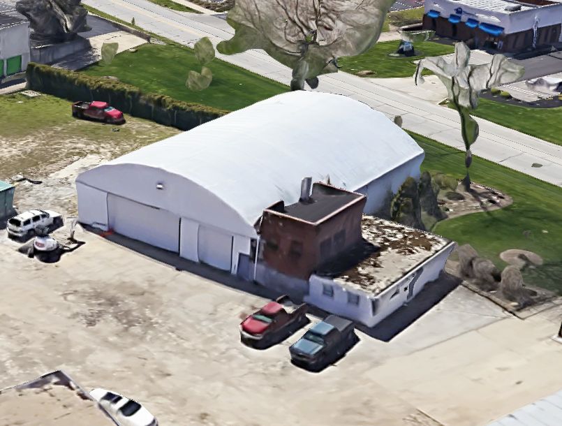 An August 2022 photo looking northwest at a former Jefferson Airport hangar, reused by the Nassif Group automobile dealership.