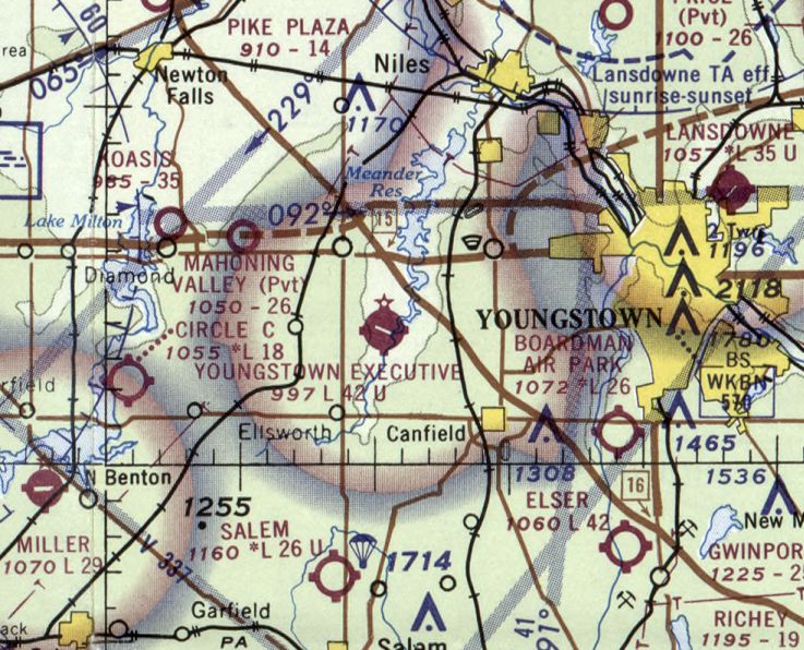 The last aeronautical chart depiction which has been located of Youngstown Executive Airport was on the October 1993 Detroit Sectional Chart. (courtesy of Ron Plante).