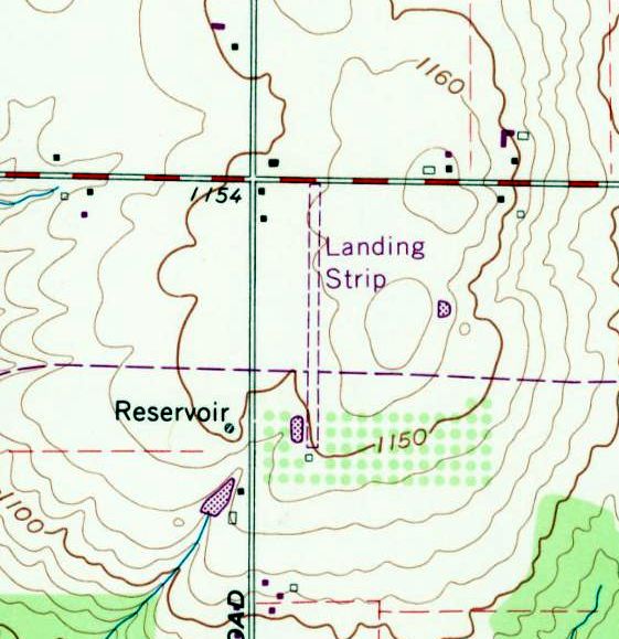 The 1970 USGS topo map depicted “Lyon Airfield” as an east/west property outline, with an extension to the east added at some point between 1960-70, and several small buildings on the west side.