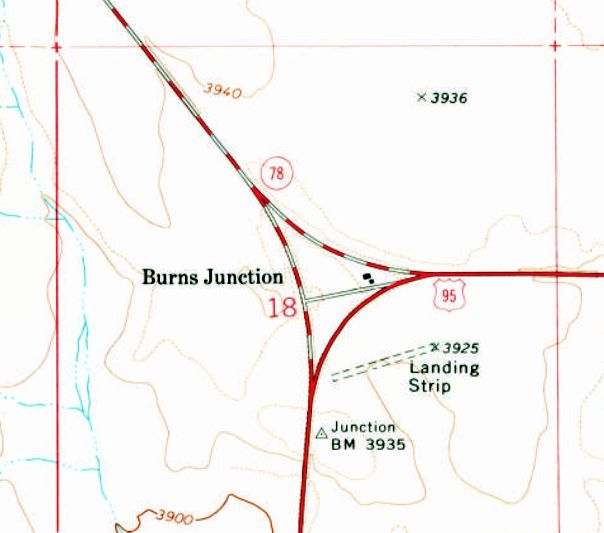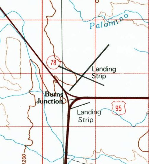 The 1994 USGS topo map depicted both the original “Landing Strip” south of Burns Junction, along with a newer & larger 2-runway “Landing Strip” which had been established north of the Junction.