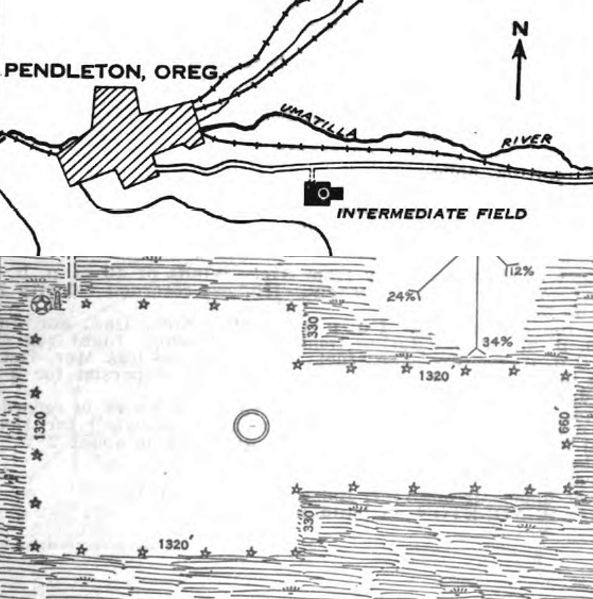 The location & layout of Pendleton Intermediate Field, as depicted on the 10/26/28 Commerce Department Airway Bulletin #478.
