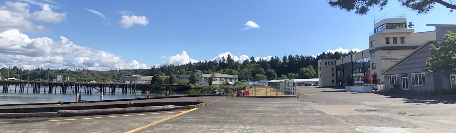 A June 2020 photo looking southwest at the Tongue Point seaplane ramp, hangars, and control tower.