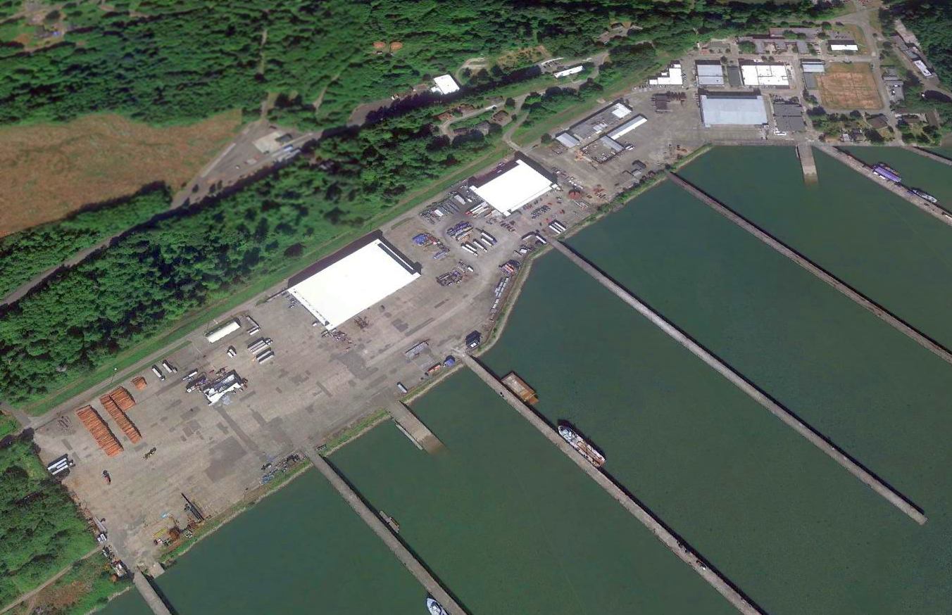 An August 2022 aerial view looking north at the Tongue Point seaplane ramp, 3 hangars, and piers.