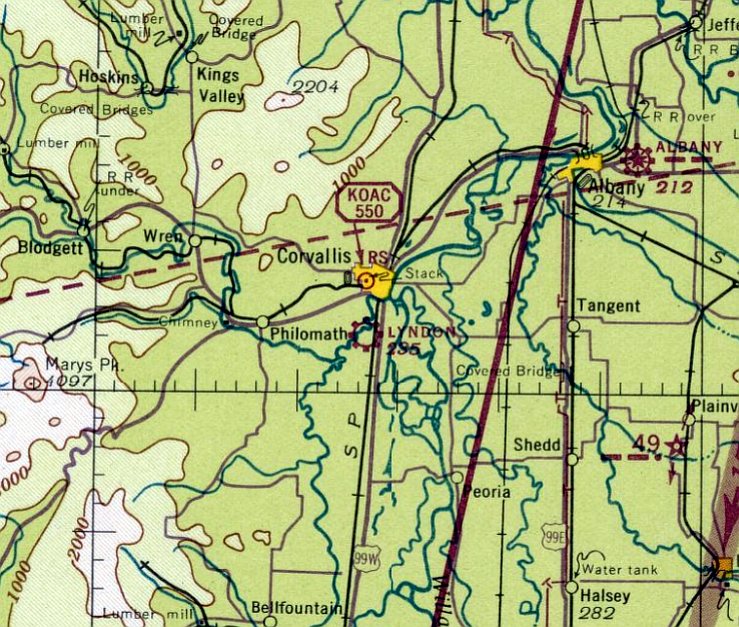 The earliest aeronautical chart depiction which has been located of Corvallis Airport was on the June 1934 Portland Sectional Chart (courtesy of Lee Corbin).