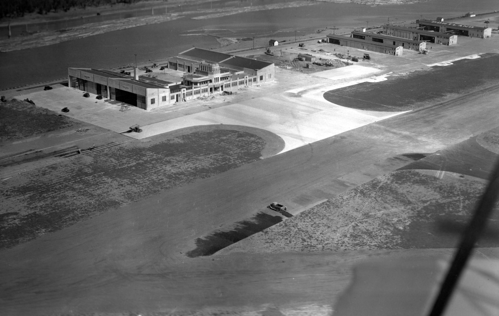 Undated photo looking west at the northern Tongue Point seaplane hangar, control tower, and seaplane ramp.