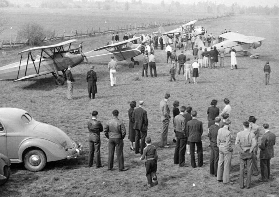 According to the caption, the airplane 2nd from left was a Rearwing Sportster 942, the next-to-last plane was a 1936 Alexander Eaglerock, and the aircraft at right was a Fairchild 24.