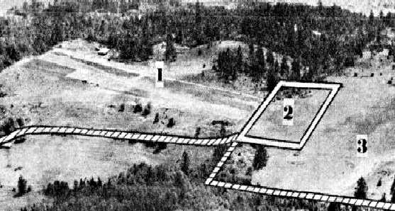 According to the caption, the road behind the hangars was Grant Street. The field was bordered on the east side by a dirt road which is now Northwest Highland Avenue.