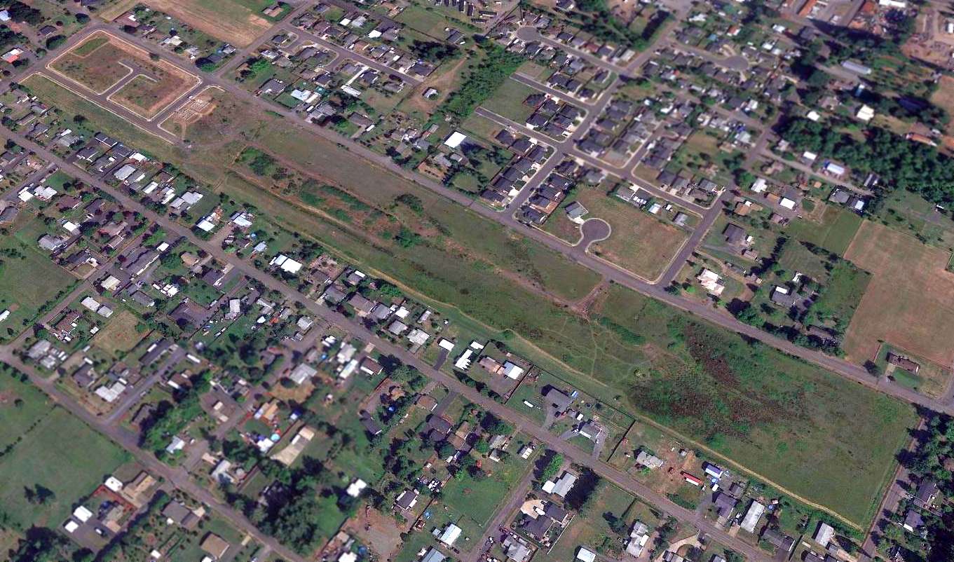 A 2020 aerial view looking northwest showed the Corvallis Junction Airport runway remained mostly intact.