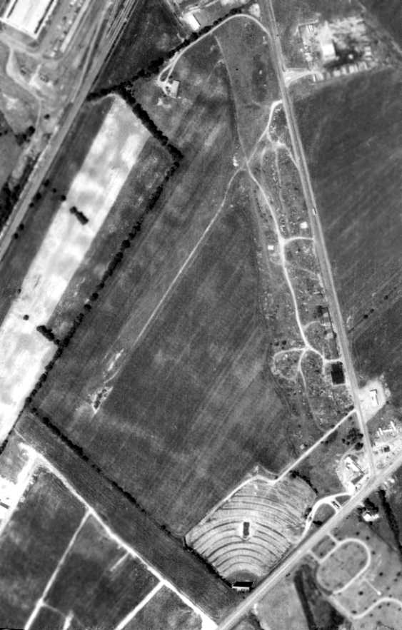 showing both paved runways still existed in very good condition, along with a group of small hangars.