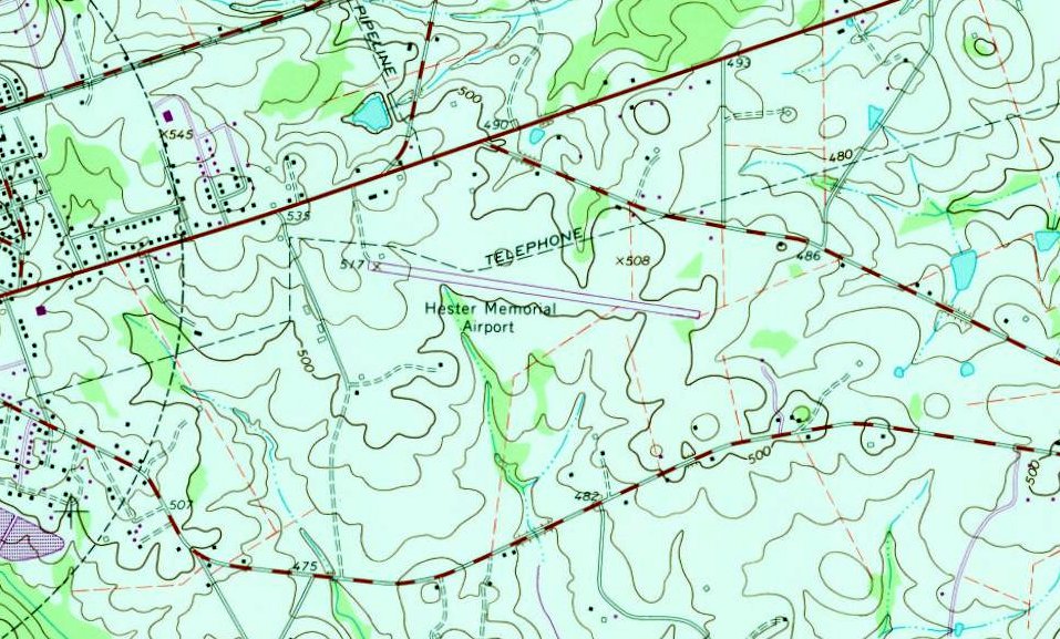 The earliest topo map depiction which has been located of Hester Airport was on the 1985 USGS topo map (courtesy of Lee Corbin).