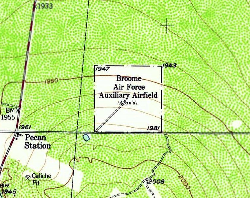 The 1957 USGS topo map (courtesy of Bob Morris) depicted “Broome Air Force Auxiliary Airfield (Abandoned)” as a 3,600' square.