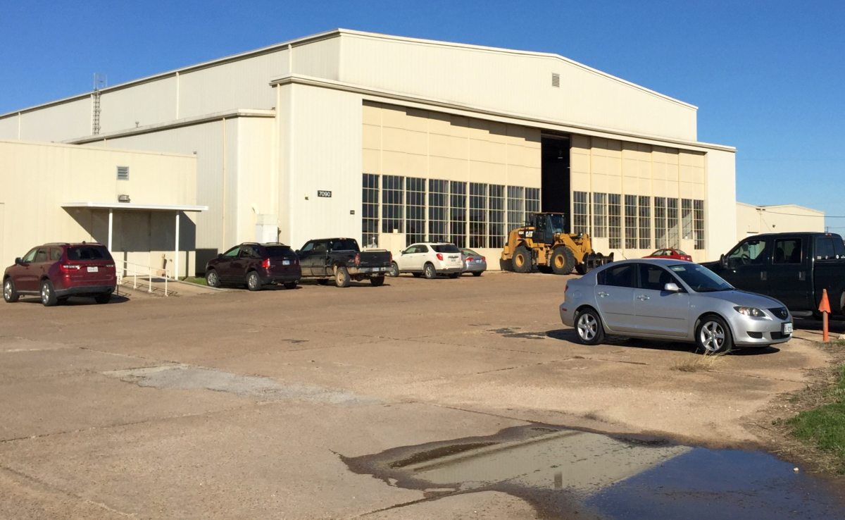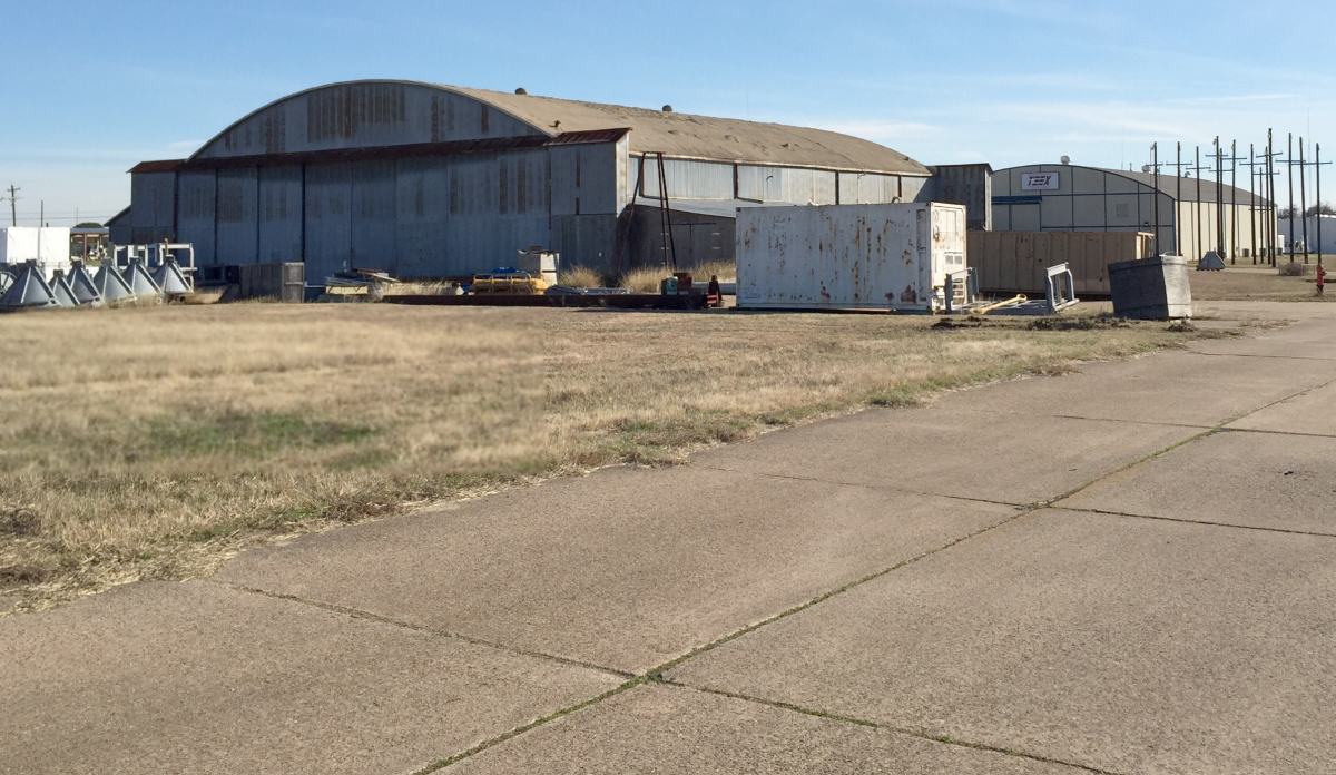 A 2024 photo looking southwest at the last remaining former Belton Airport buildings.