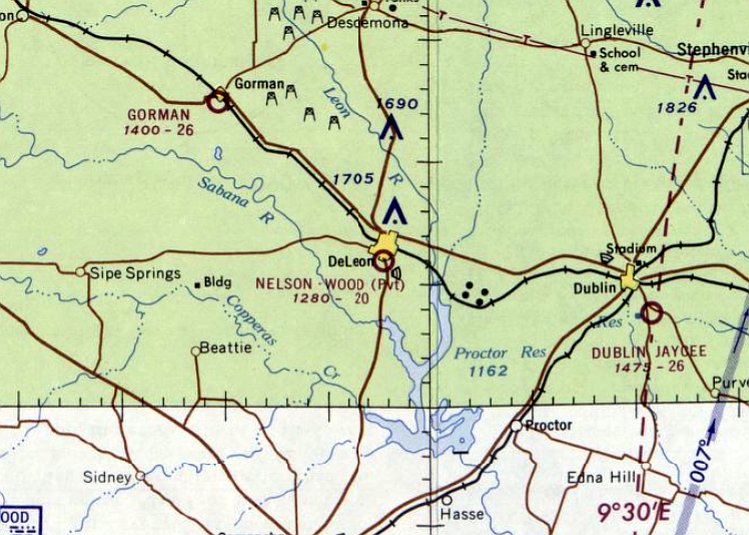The last aeronautical chart depiction which has been located of De Leon Airport was on the July 1968 Dallas Sectional Chart.