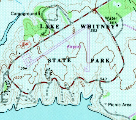 It depicted De Leon Airport as having a single paved northwest/southeast runway, with a ramp & a few small buildings on the northwest side.