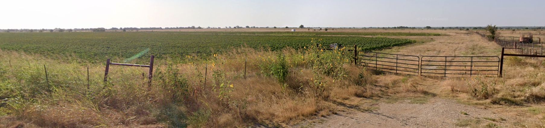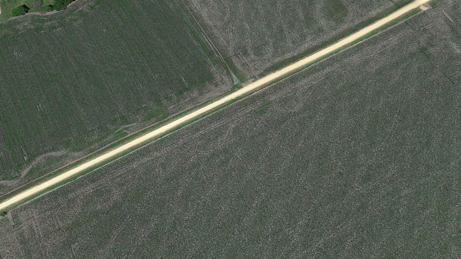 A 2021 aerial view looking northwest shows only the faintest trace remaining of the Lesikar Farms Airport runway, with the land having returned to agriculture.