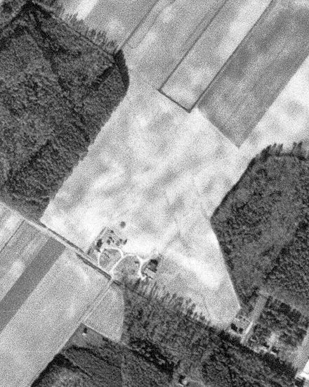 showed the field to have 2 unpaved runways in an X-shape, with a few small buildings on the southwest side.