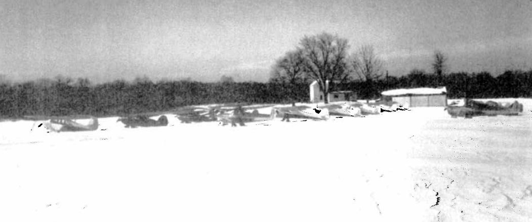 A winter 1947 photo of a dozen light single-engine general aviation aircraft at a snow-covered Falls Church Airpark (from the Falls Church Public Library, courtesy of Derek Rowan).