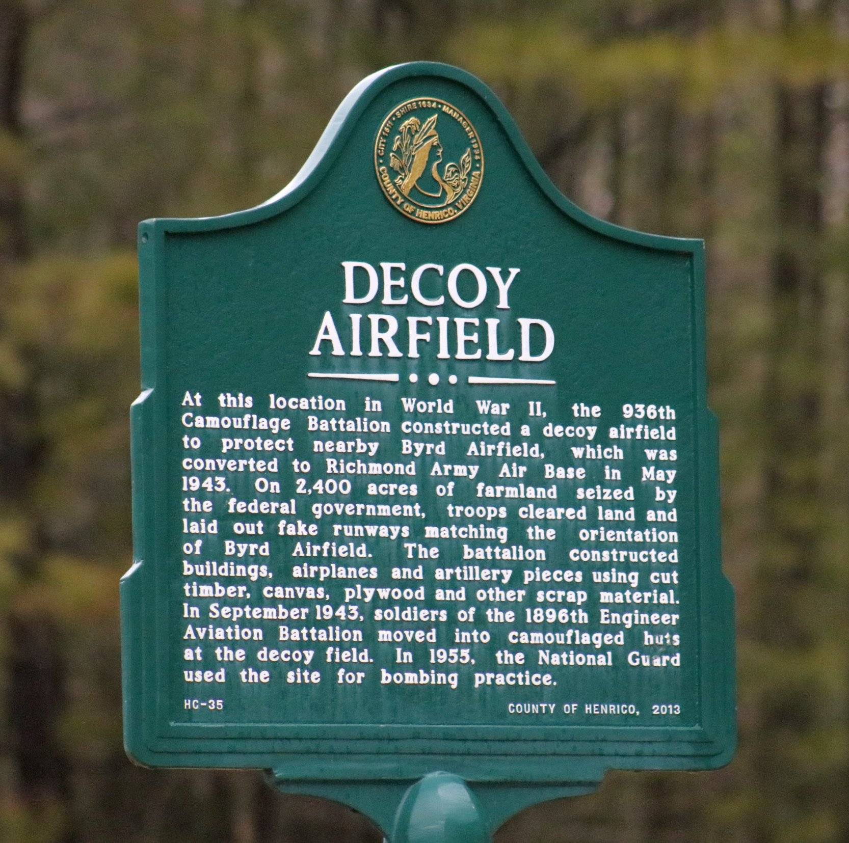 In 2013 Henrico County erected a historical plaque at the site entitled “Decoy Airfield”.