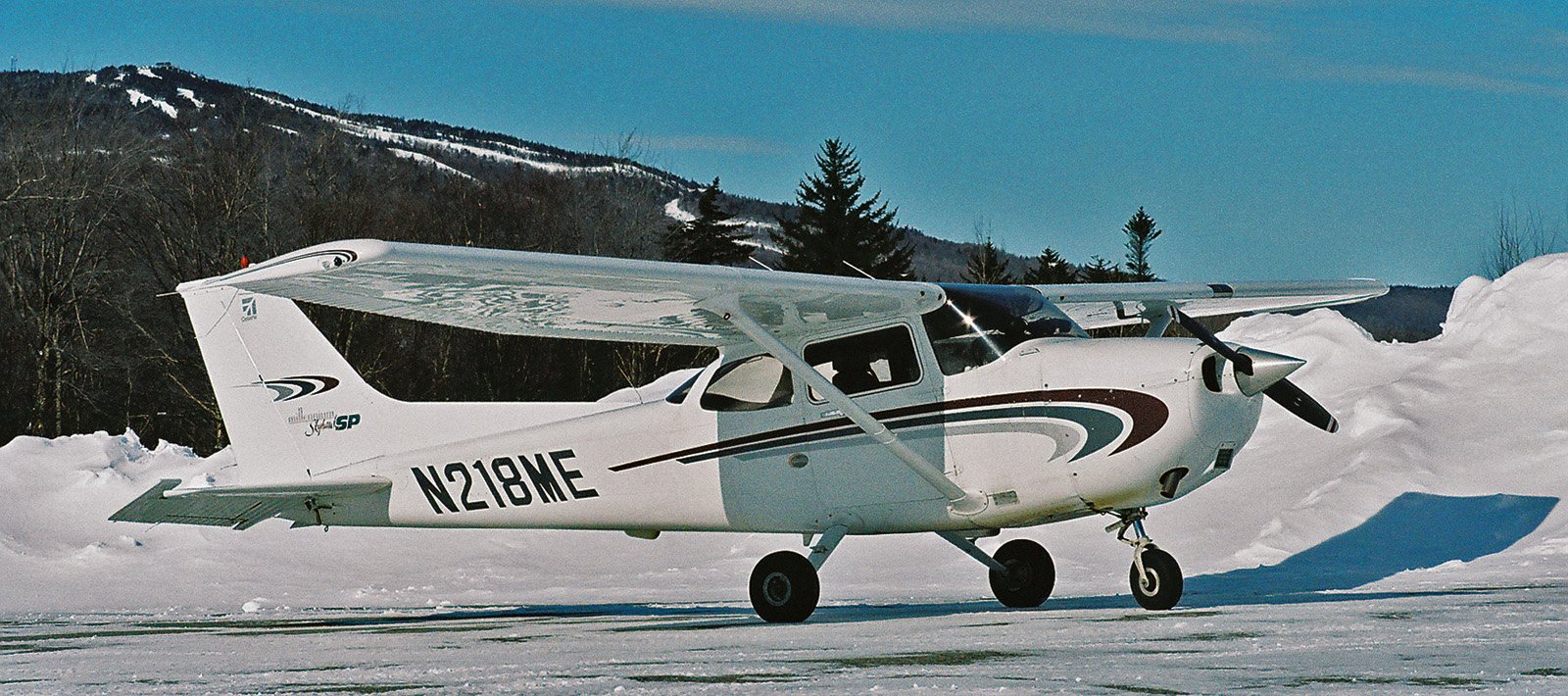A 1/29/05 photo by Tom Hildreth of a Cessna 172 at Mt Snow Airport, with the downhill ski trails visible in the background.