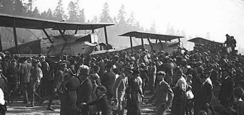A 4/22/28 photo (courtesy of Arleigh Movitz) of a large crowd attending the dedication of the Ebey Island Airport,