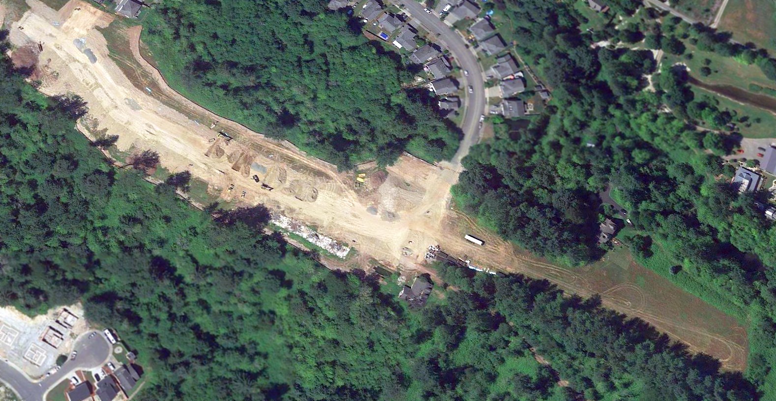 A 2024 aerial view looking southeast showed several small buildings had been built over the center of the former Wax Orchards Airport runway.
