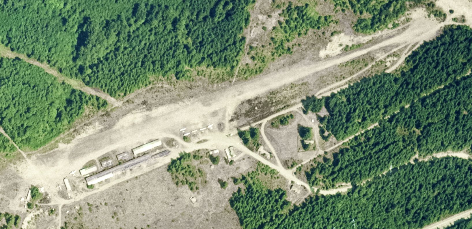 which depicted it as having a single north/south unpaved runway & 6 light single-engine aircraft were parked on its west side.