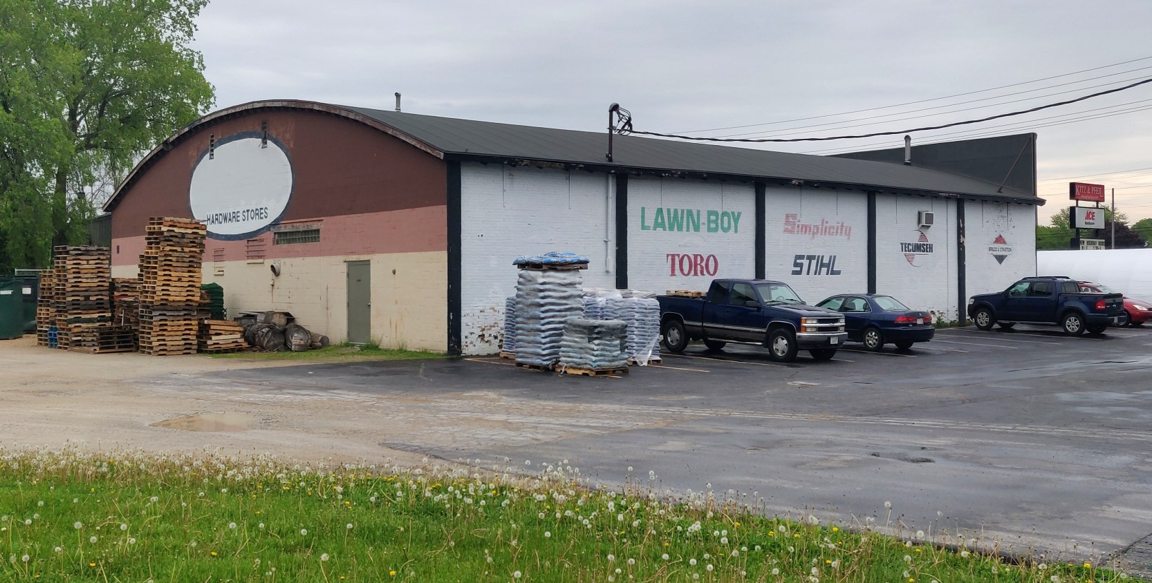 A 5/20/21 photo by Drew Knoll-Owen looking northeast showed the former Whiting Airport hangar, reused as a hardware store.