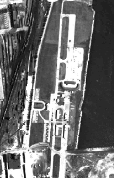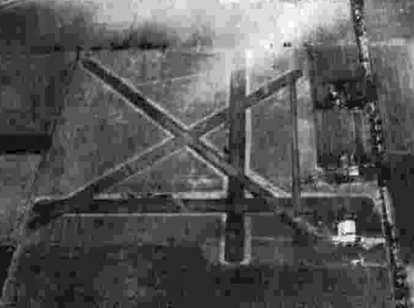 A control tower was situated midway along the south side of the runway, and a ramp with 12 hangars was along the north side.