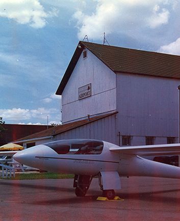 An undated photo of a retractable gear glider in front of the barn at the Playboy Airport.