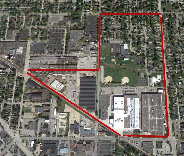 The outline of Salzer Field (annotated by Joe Farwell) on a 2015 aerial view looking north shows no trace remaining of the airport.