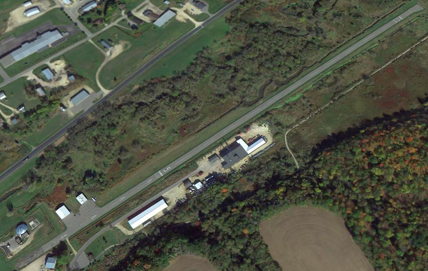 A 2023 photo looking northeast at Verona Airport's hangars & Runway 5.