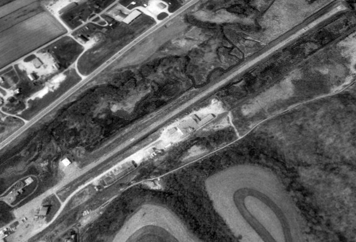 and the row of hangars previously seen at the northwest corner had been replaced by a small set of buildings on the east side of the current runways.