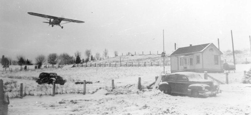 A 1941 photo showed a Piper J3 Cub on short final approach to a snowy Princeton Municipal Airport (courtesy of Rick Harshbarger).